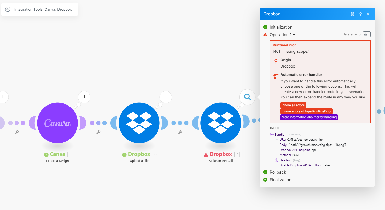 I’m running into a 401 “missing_scope” error while integrating Dropbox with Make.com, and I’d love your insight.