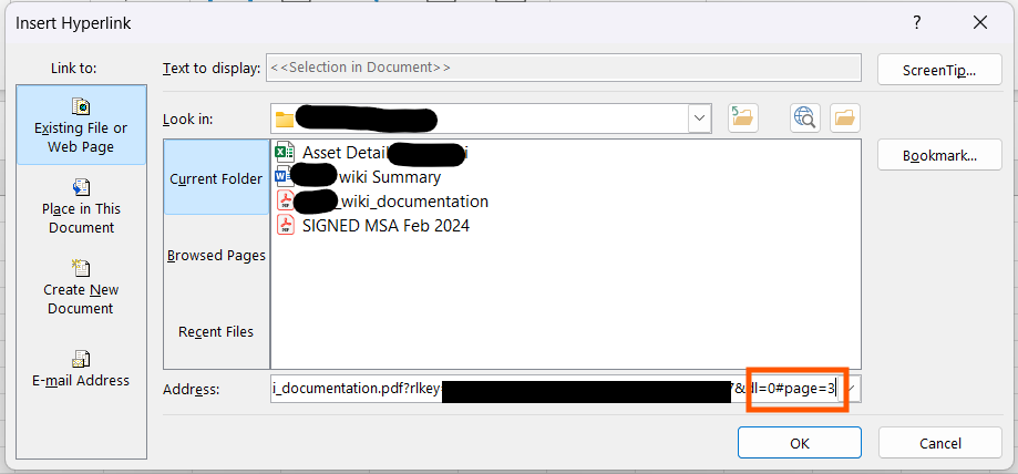 How do I link a specific pdf page, opened in dropbox.com, to an Excel cell?