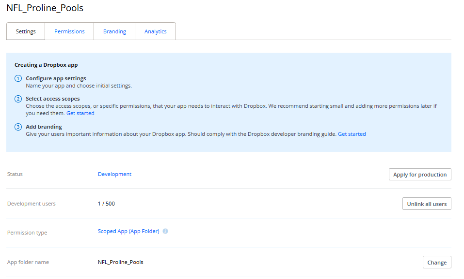 I am developing an html file for our group to do weekly picks online. I have to program working where the users can pick their own games. However I need a place to store and retrieve the information selected so other users can view current picks. I want to use Dropbox as my online repository. Through my internet searches, I created an app in Dropbox and made it available to anyone with the link. However when I try to implement a function to upload the file I get the following error :