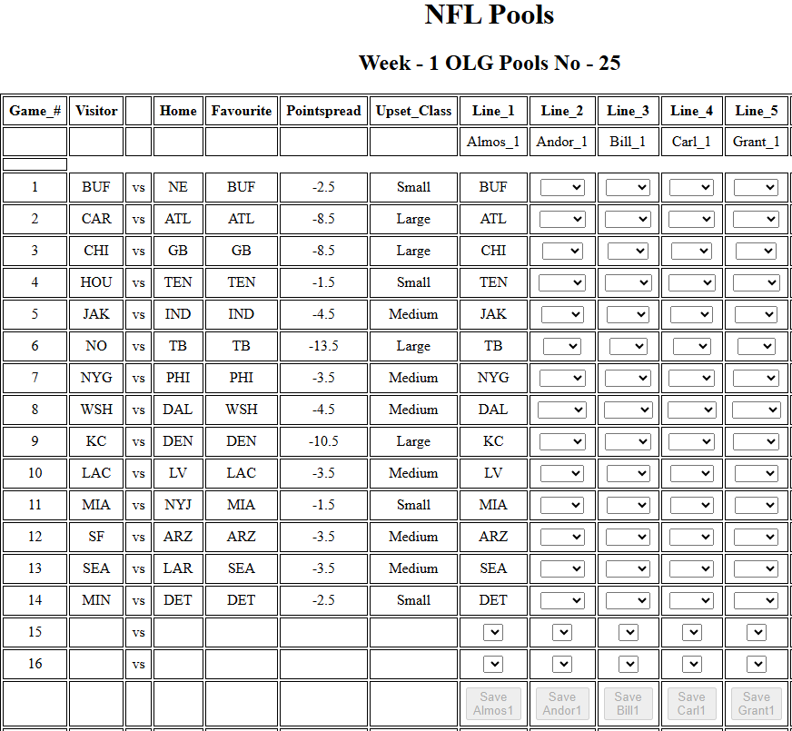 Here is what the html looks like. The save button for each line will become active once there are valid picks for all games. At this point the file (in this case an array with selected picks) should be uploaded to the dropbox api. Other users (7) will need to be able to upload and download files (only done by javascript code) to upload and download the most current selection information.