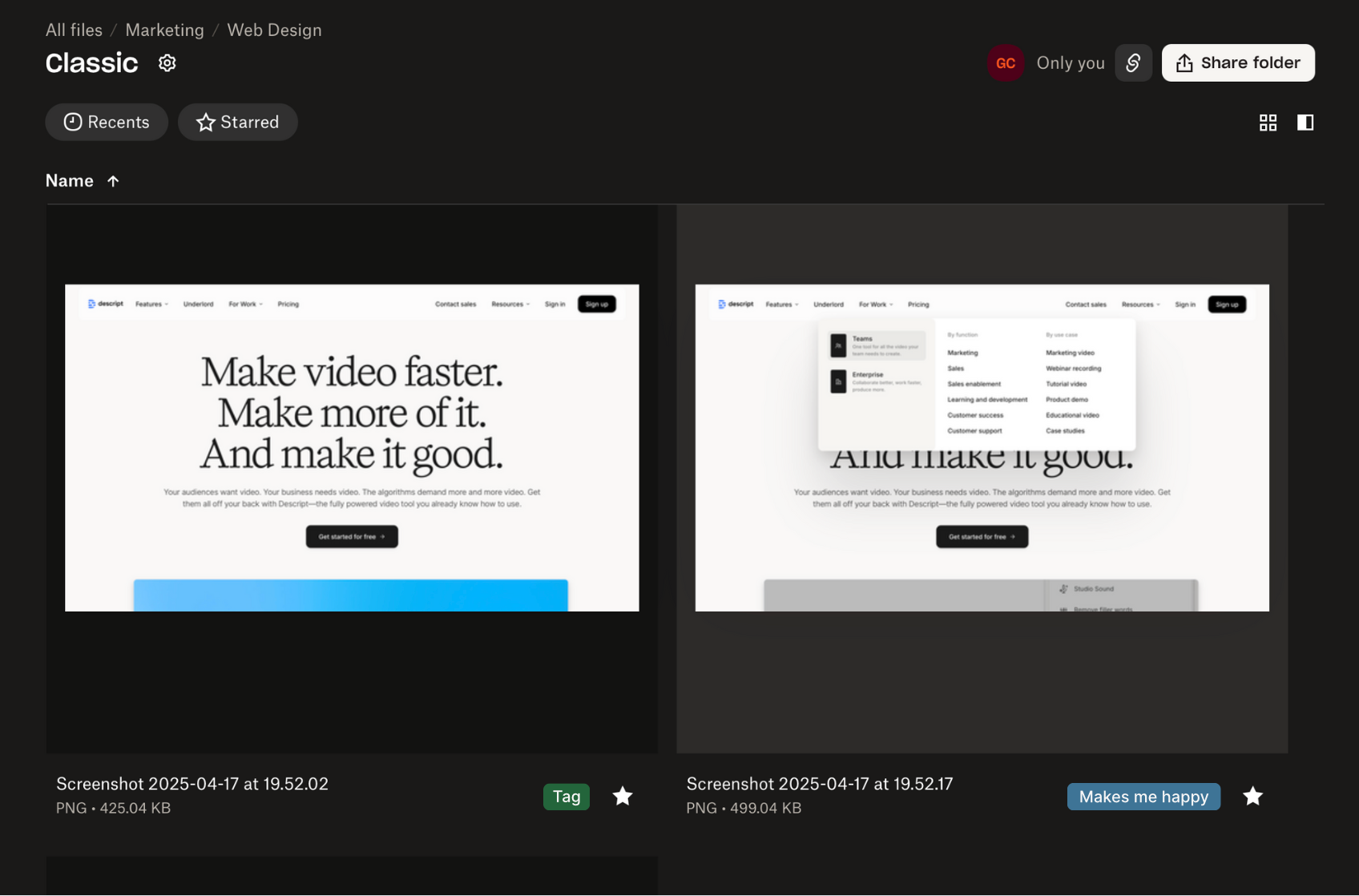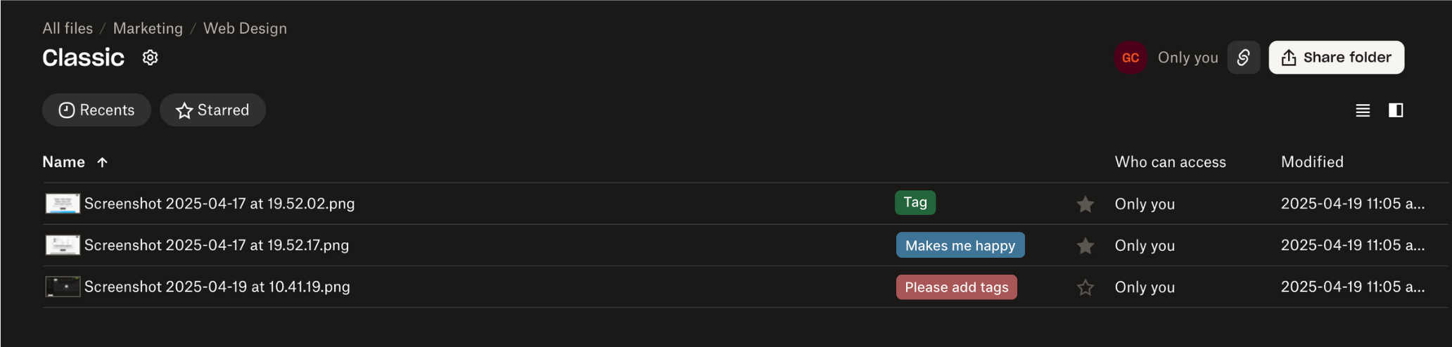 I would really really love to be able to see tags appear besides the name of the files in any view, or folder, and on the mobile app, web version, and desktop app. Just a nice coloured tag left to the star icon would be wonderful.
