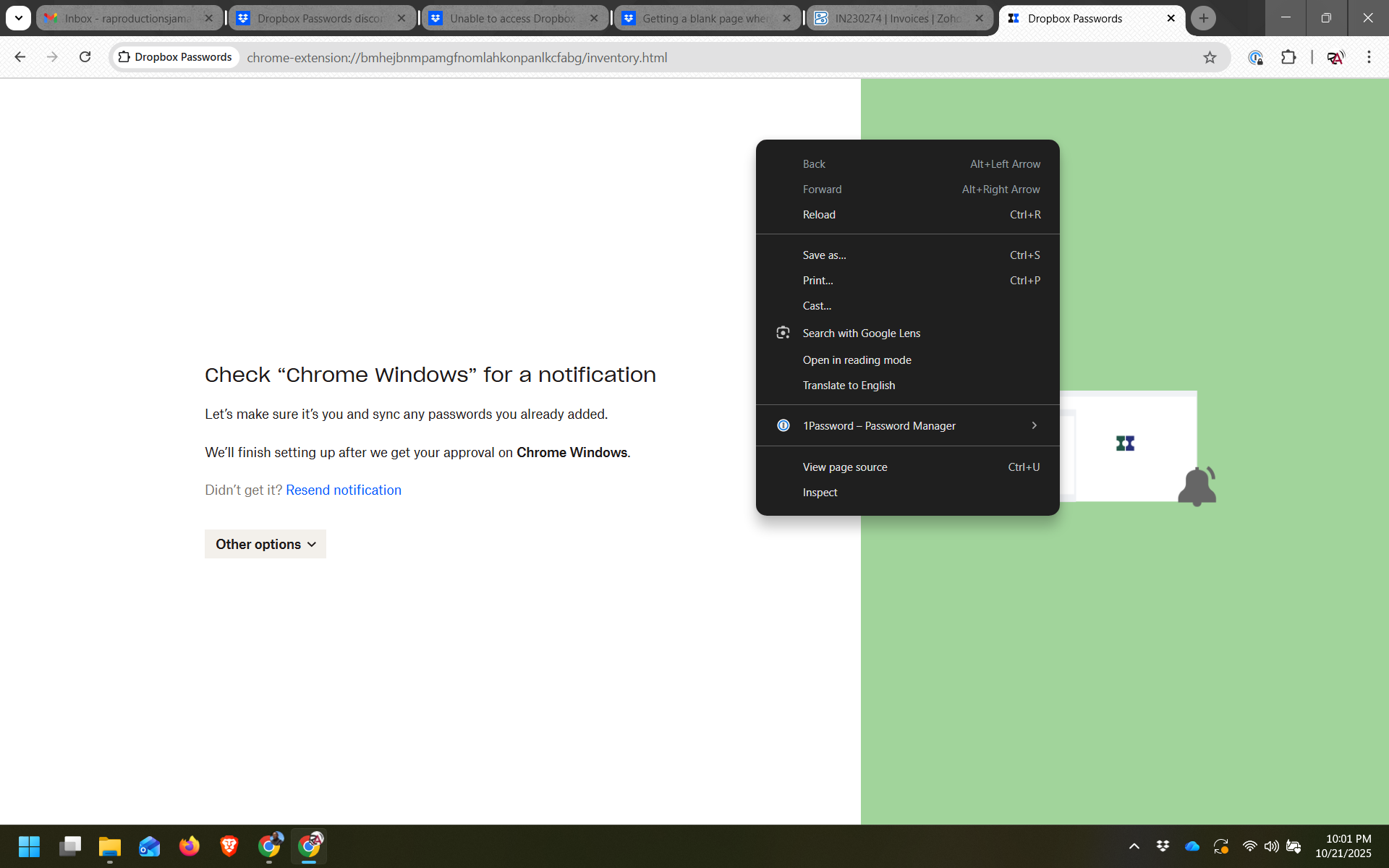 Having a difficult time accessing Dropbox Passwords in order to retrieve .csv file to migrate to 1Password. I am getting the window shown below and no further.
