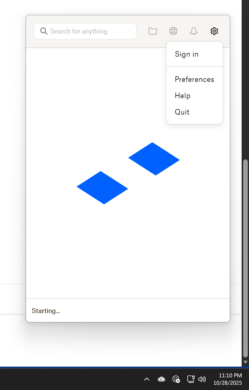 I installed the Dropbox Application from the Windows Store. I proceeded to complete the installation, logged in through the Browser, at which point I was asked to approve the login via the Dropbox mobile app. I accepted the login but was informed that I had too many logins (more than 3), so I deleted from logins my old iPhone, and older version of my PC (named Mike-PC) that connected 3 months prior. I was then able to complete the installation and see a Windows Explorer window listing my Dropbox Folder Structure. I closed the Windows Explorer Window and clicked on the Application. The application is stuck at "starting"