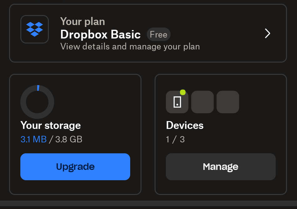 I've deleted all of the files in my Dropbox with the exception of one small word document. MySpace still says that I've used up 3.1/ 3.8 GB but elsewhere in my storage says that I'm only using 0.1% storage.