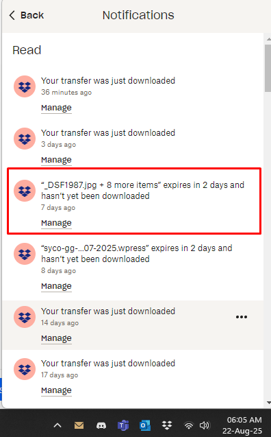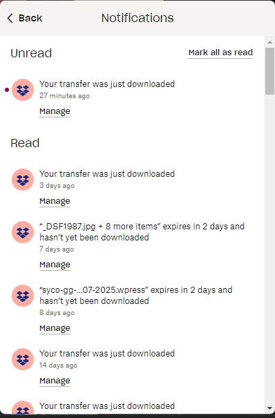 Do you guys have any clue what transfers are downloaded without clicking on the little button "Manage"? You are viewing notification on the app, but clicking on manage will get you to the browser and look below, Dropbox doesn't have enough room to show the full name of the transfer?