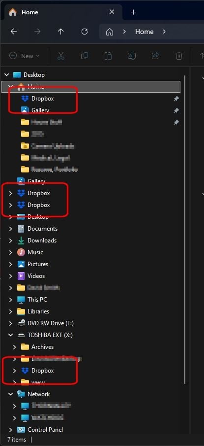 How do I get rid of Dropbox showing in multiple places in Windows Explorer? See screenshots. Dropbox functions fine it just appears in multiple places for some reason. This has actually been going on for a year or so but now there's four of them. How many am I really supposed to have? They all go to the same place but ...yea, this isn't right - is it? This feels like an obvious problem that should be addressed (like the various sync problems) but it doesn't seem like there have been many updates at all to the desktop app in quite some time.