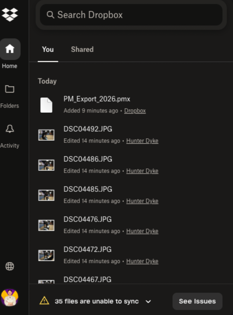 As you can see, has full disk access and no firewall issues, but won't sync. I have tried to "fix Hardlinks, etc". Fixing hardlinks only resolves it temporarily - when more files arrive in the folder, the issue persists. My dropbox storage is not full, neither is my computer. I have seen other troubleshooting steps to move images out then back in, but that is not a solution to me. Quitting, then relaunching does not solve.