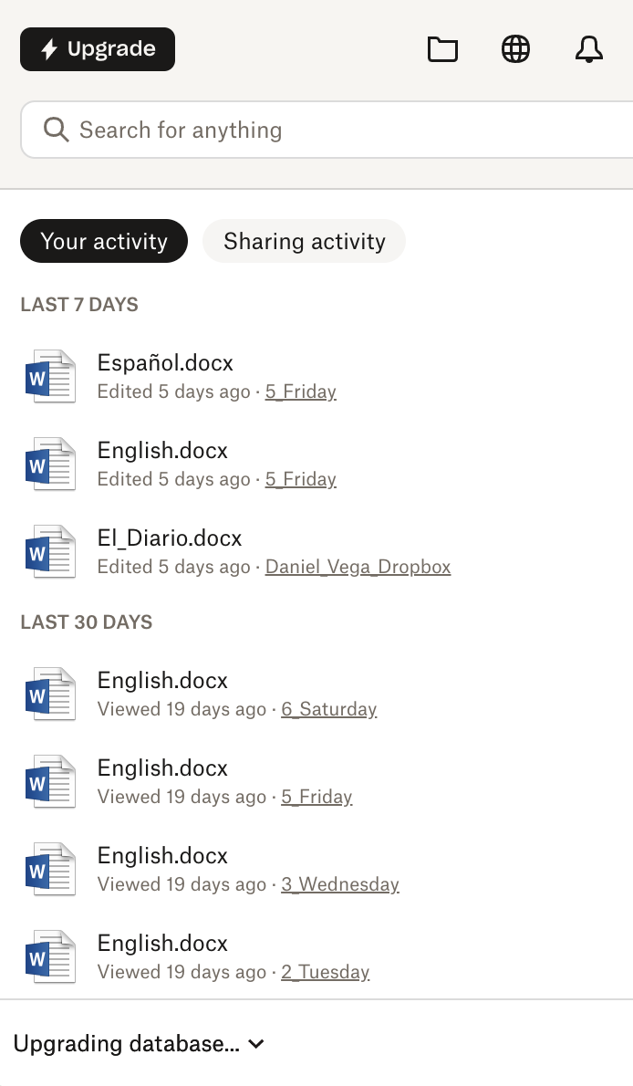 For several days, my Dropbox App does not reflect the contents of my Dropbox. When I sign in to dropbox.com, I can see that all my files are on my account. But when I click on the app on my laptop, I see the message "Upgrading Database..." Someone on the forum suggested leaving my computer on overnight to allow the upgrade to finish, but this tactic did not work. As it stands, I am unable to use the Dropbox App on my laptop.