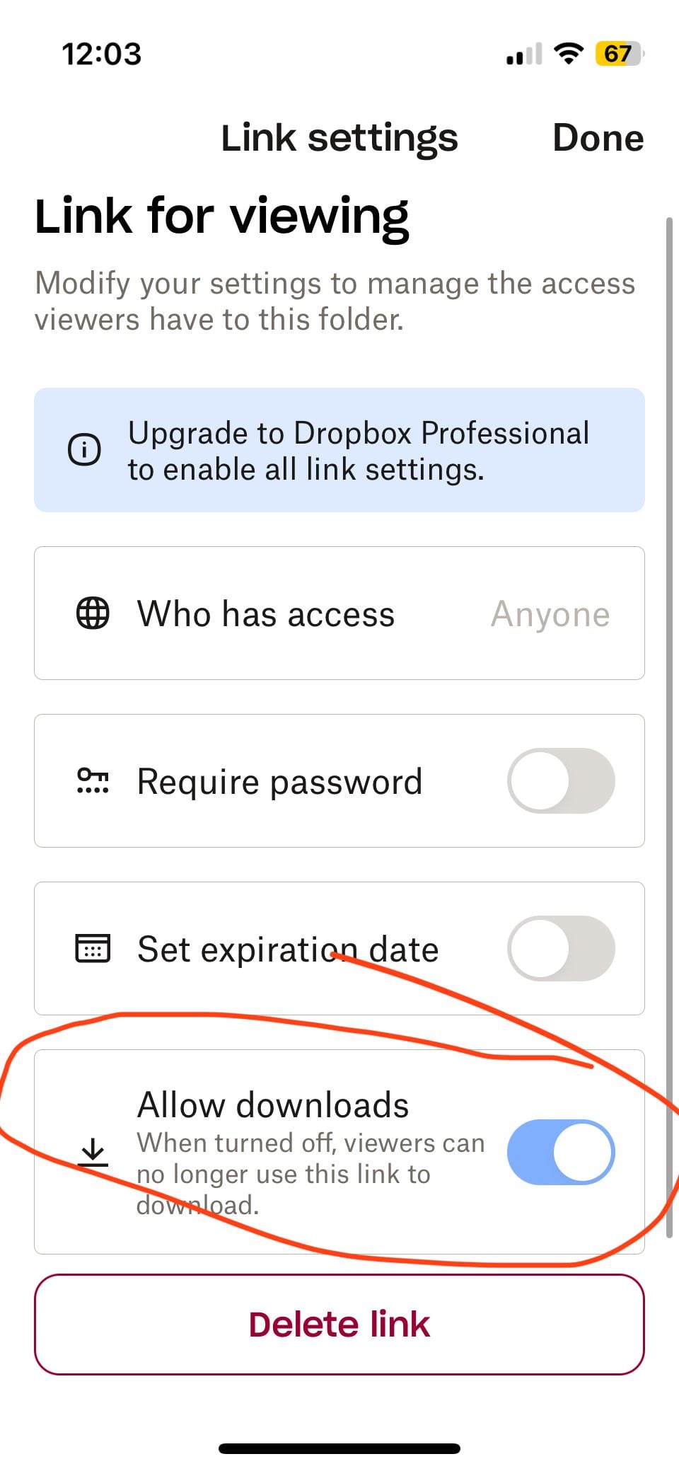 When I noticed this today, I went to the viewable option instead and then looked at the settings. There are options (see screenshot below) but it seems like the option to have downloads enabled on viewable links is greyed out? But also kind of difficult to tell – it looks lighter blue than normal GUI switches I've seen in the past... It looks like it is on by default but I don't know if it being greyed out means that it is stuck on or that it is not functional (meaning even though its showing as on, the greyed-out-ness means it is actually off AKA no downloads for recipient).