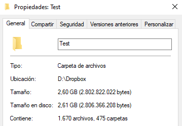 Tenemos una carpeta dentro de Dropbox del tamaño que indica.