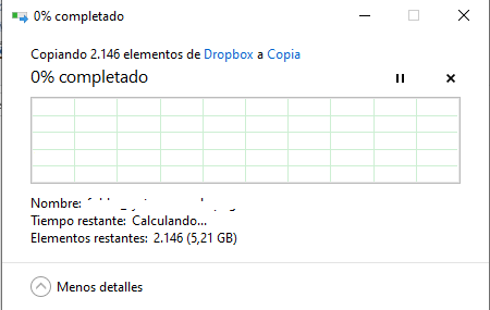 Procedo a copiarla hacia fuera de dropbox, puede ser en el mismo disco o hacia otro disco. Windows empieza a calcular tamaño del contenido a copiar y muestra el doble.