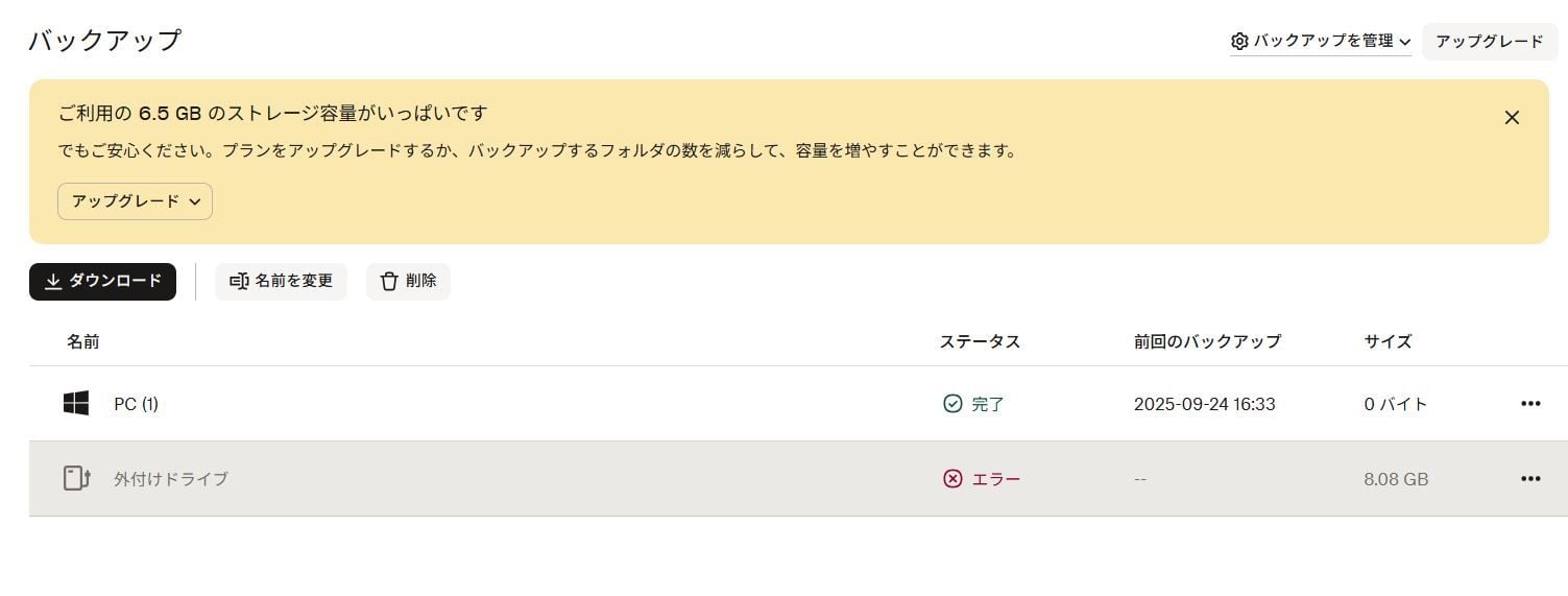 - [バックアップを管理]で[バックアップを削除]をクリックします。
